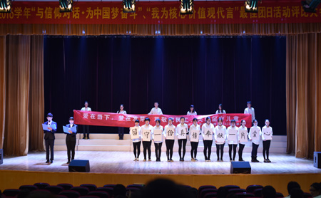 自去年4月以来,2013级、2014级共127个团支部围绕“与信仰对话•为中国梦奋斗”“我为核心价值观代言”主题开展了团日活动。经过前期各系分团委初评,35个支部脱颖而出参加复评。经过院团委审核评选出19个支部获得三等奖,其余16个支部进入特等、一等、二等奖的展示答辩。评比大会分为支部展示和评委问答两个环节,各支部从爱党爱国、革命传统、青年学生成长、农民工子女关爱、环境保护、校园环境美化、创新创业、传统文化传承、食品卫生安全等进行了精彩的展示。经过激烈的角逐,最终化工与制药工程系2014级药事管理专业2班团支部获得特等奖,经济管理系2014级会计学专业2班等5个团支部获得一等奖,经济管理系2014级会计学专业1班等10个团支部获得二等奖。上届最佳团日活动特等奖支部代表李成蹊分享了开展团日活动的经验与收获。最后,潘明烽书记强调,团日活动是学院团组织加强基层组织建设的重要手段,积极开展主题团日活动对增强基层团组织的凝聚力、战斗力,对于提高团支部的活力,加强大学生思想政治教育,提升团员青年的先锋模范意识和综合素质,丰富校园文化生活发挥着重要的作用。