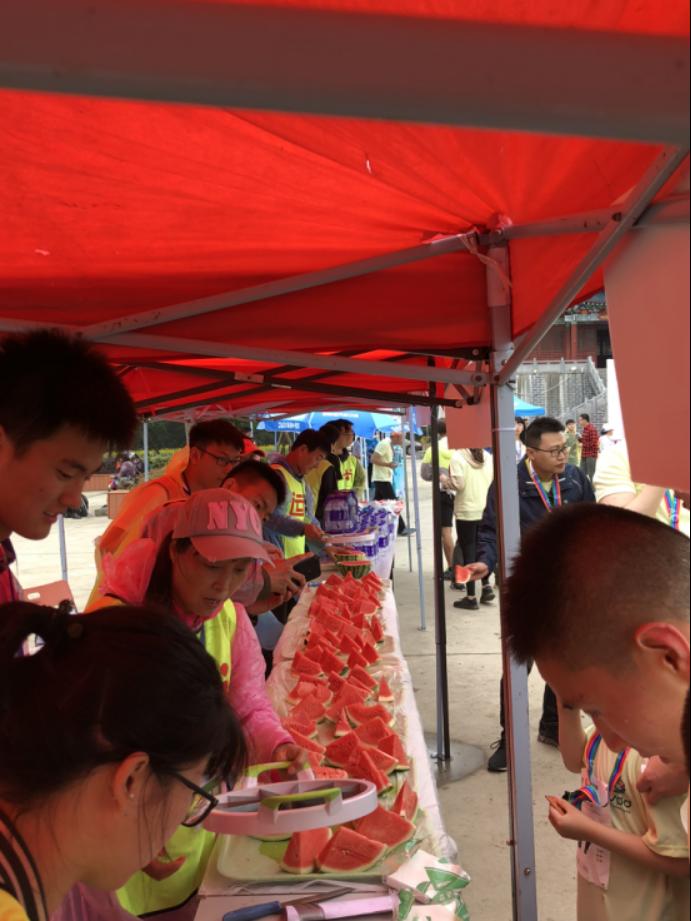 志愿者为参赛选手分发解暑水果
